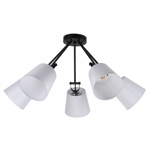 Lámpara de techo de 5 luces de 10W, diseñada en acero , tela con acabados en negro y cromo, para un ambiente moderno. Rosca E27.