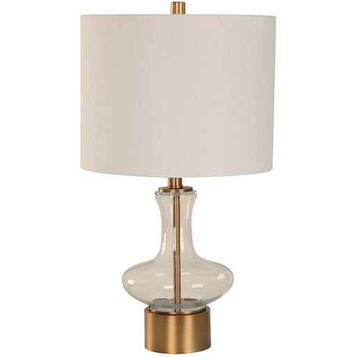 Lámpara de mesa de 1 luz de 100W, diseñada en acero , vidrio y tela, con acabados en bronce antiguo para un ambiente moderno. Rosca E27.