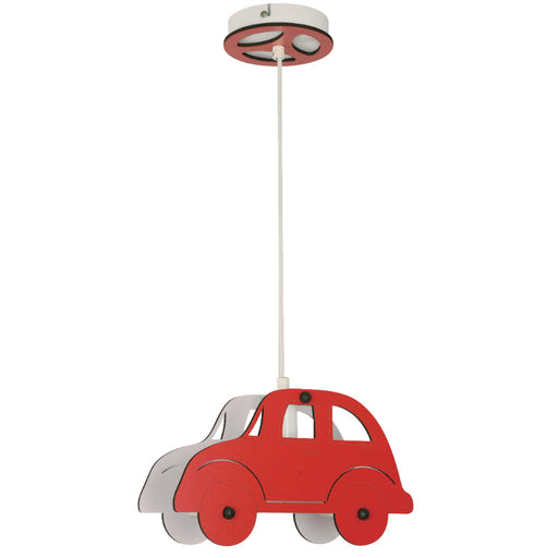 LÁMPARA DE TECHO DE 1 LUZ DE 40W, DISEÑADA EN PLÁSTICO , METAL Y MDF, CON ACABADOS EN ROJO Y BLANCO, PARA UN AMBIENTE INFANTIL. ROSCA E14.