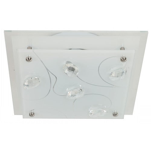 LÁMPARA DE TECHO DE 2 LUCES DE 60W, DISEÑADA EN ACERO , VIDRIO CON ACABADOS EN NÍQUEL SATINADO Y CROMO, PARA UN AMBIENTE MODERNO. ROSCA E27.