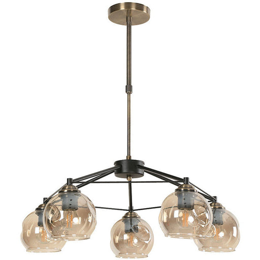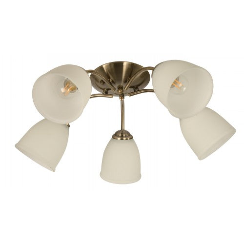 Lámpara de techo de 5 luces de 40W, diseñada en acero , vidrio con acabados en bronce antiguo para un ambiente moderno. Rosca E27.