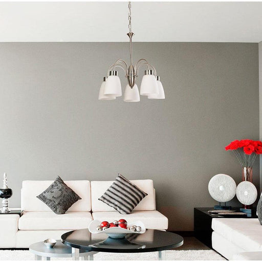 Esta lámpara colgante de níquel satinado de 5 luces es una opción perfecta para todos aquellos que buscan una lámpara moderna con un diseño clásico...