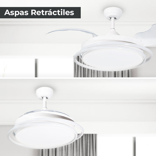 Ventilador De Techo Retráctil 42" estilo spring, Luz LED, Blanco Mate, 6 Velocidades